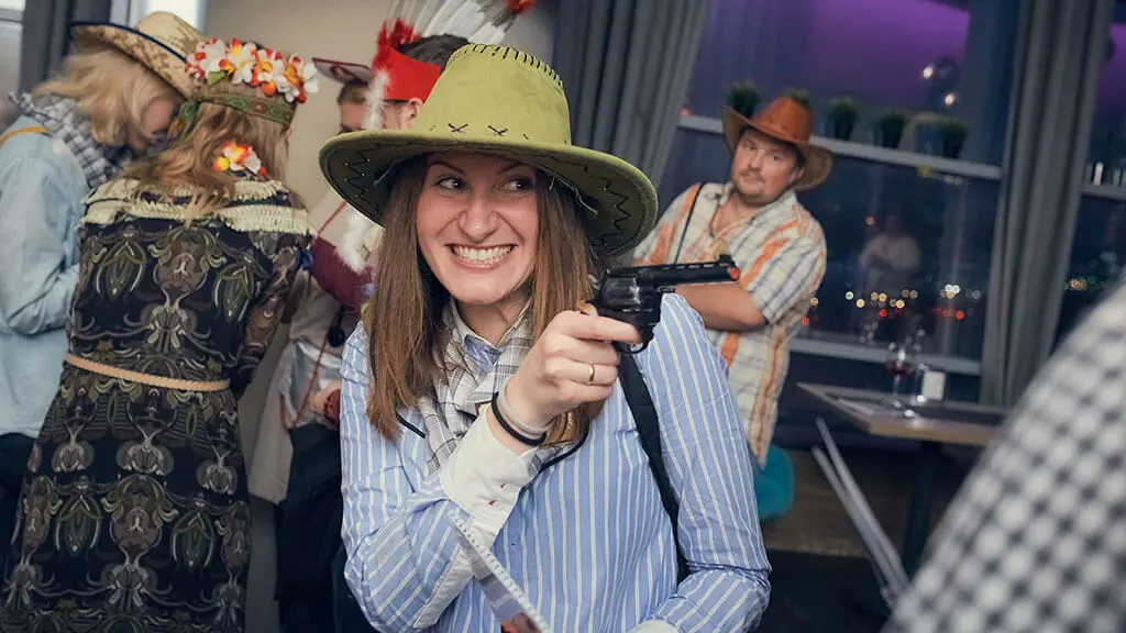 Тимбилдинг квест «Где-то на Диком Западе»: В салуне даже девушки-ковбои выглядят, как героини блокбастера: улыбка, прицел, и вот уже всё понятно — не игрушки она в руках держит, а свои шансы на победу и сердце врага!